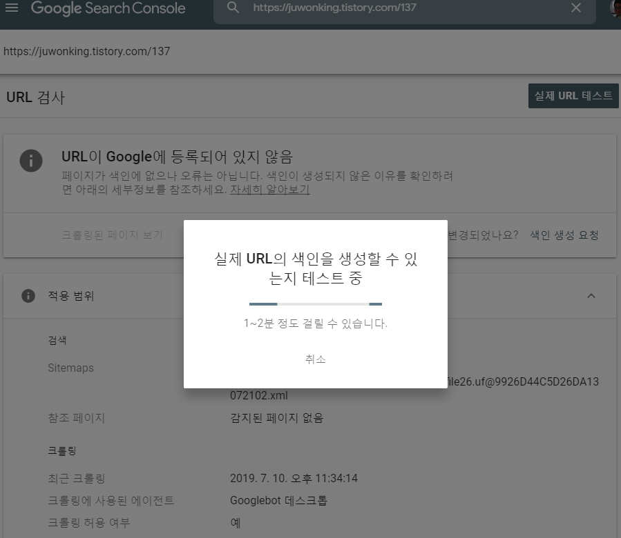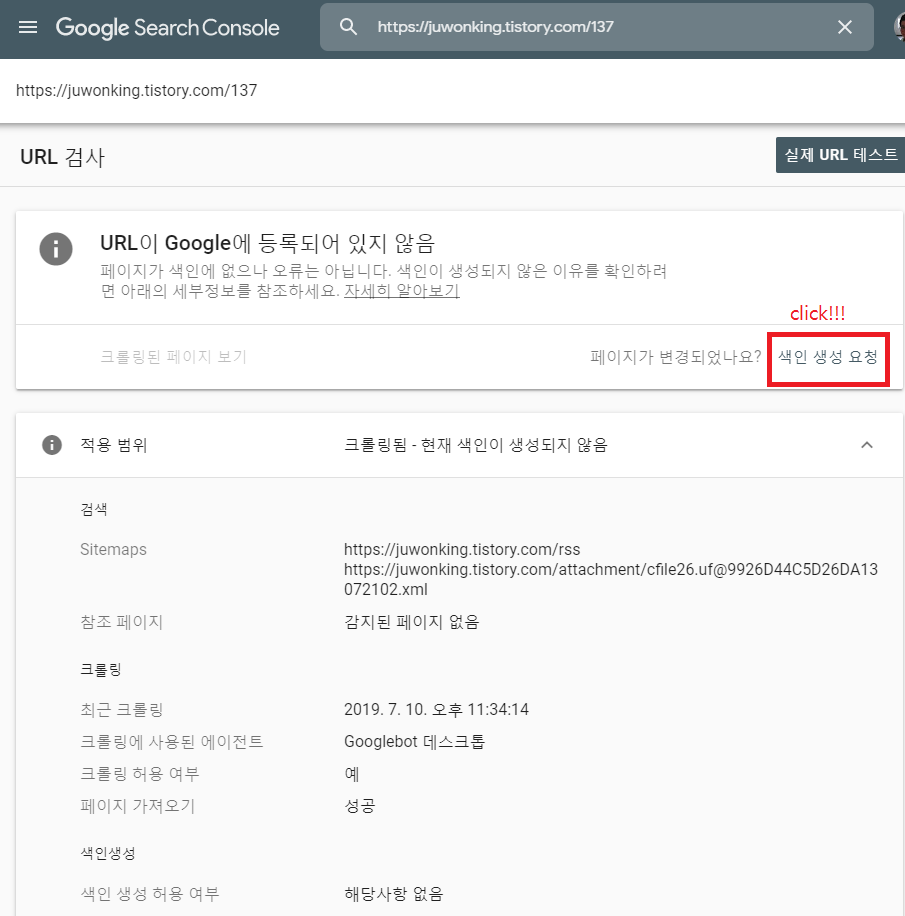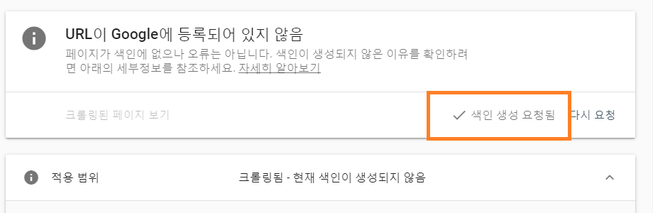 색인생성을 신청해서 요청된 상태임이 위의 표시처럼 바뀌어 있습니다.
