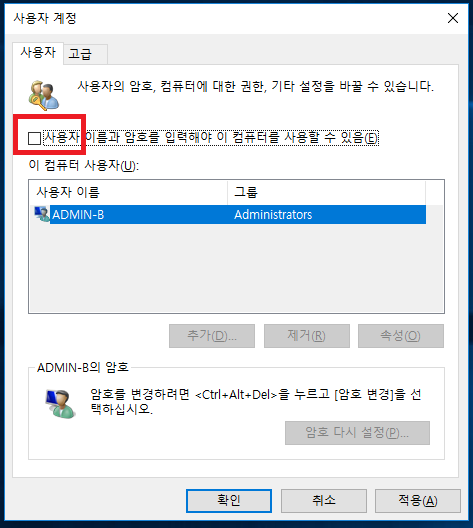 '사용자 이름과 암호를 입력해야 이 컴퓨터를 사용할 수 있음'