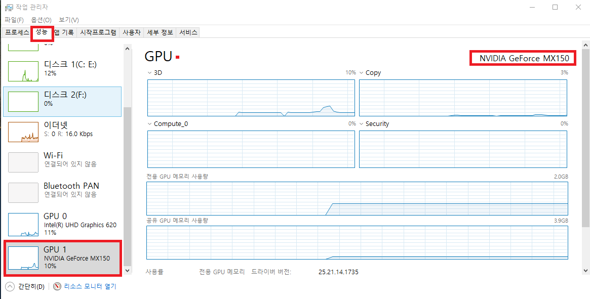그런데 추가 가동하는 Nvidia mx150이 필요시 추가 가동을 합니다.