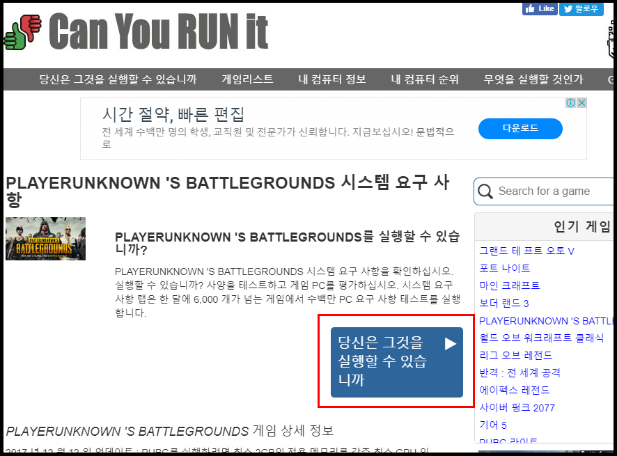 캔유런잇 이라는 사이트에 접속해서 체크할 게임을 선택후