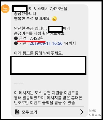 웬 돈을 송금했는데 정체모를 곳으로 링크와 함께 받으라네요~