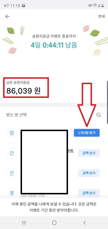 보낼만한 지인들의 이름옆에 있는 금액보기를 누르시고