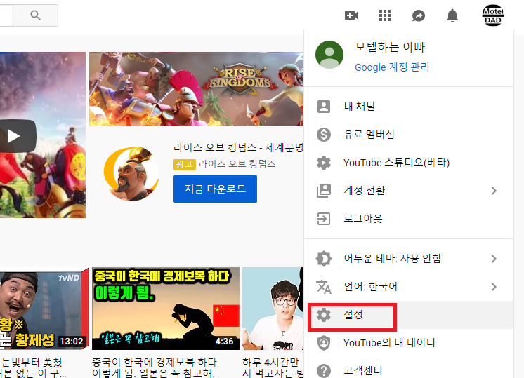 유투브에서 로그인 하신후 설정 부분으로 들어갑니다.
