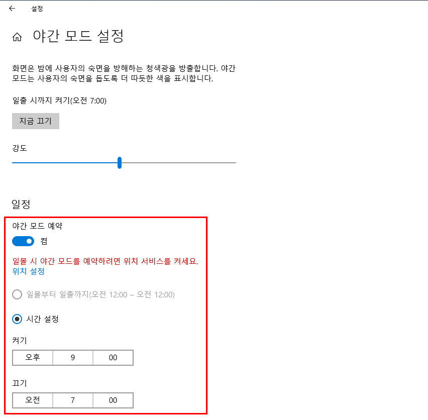 야간모드가 켜지고 꺼지는 시간을 설정해 두시면