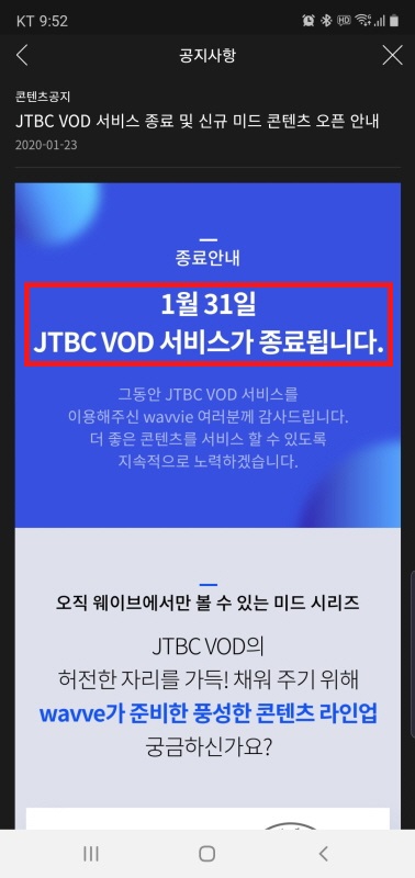[웨이브 공지사항] wavve 어플에서 JTBC 다시보기 종료