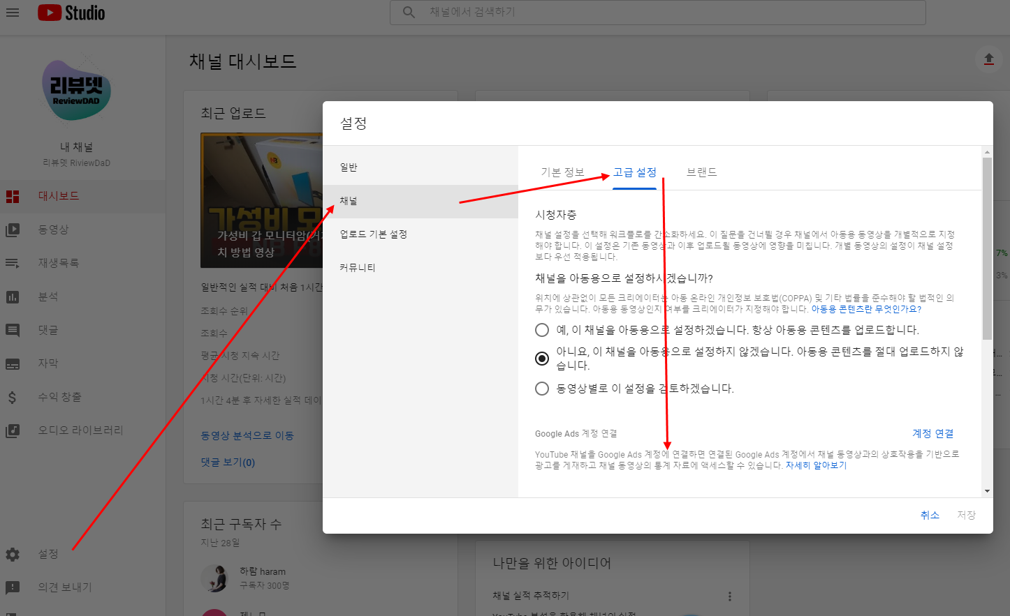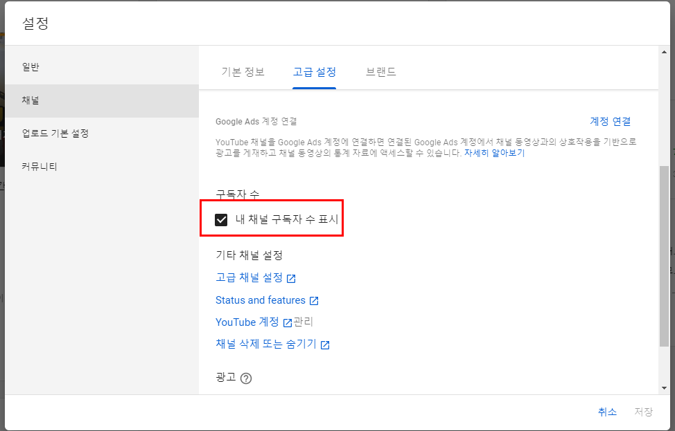 바로아래에 '내 채널 구독자 수 표시'라는 체크 항목이 있죠