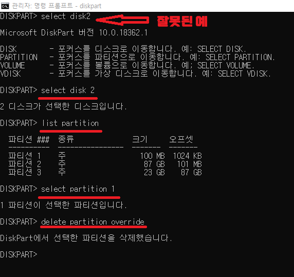 저는 디스크 2의 파티션을 삭제할 겁니다.