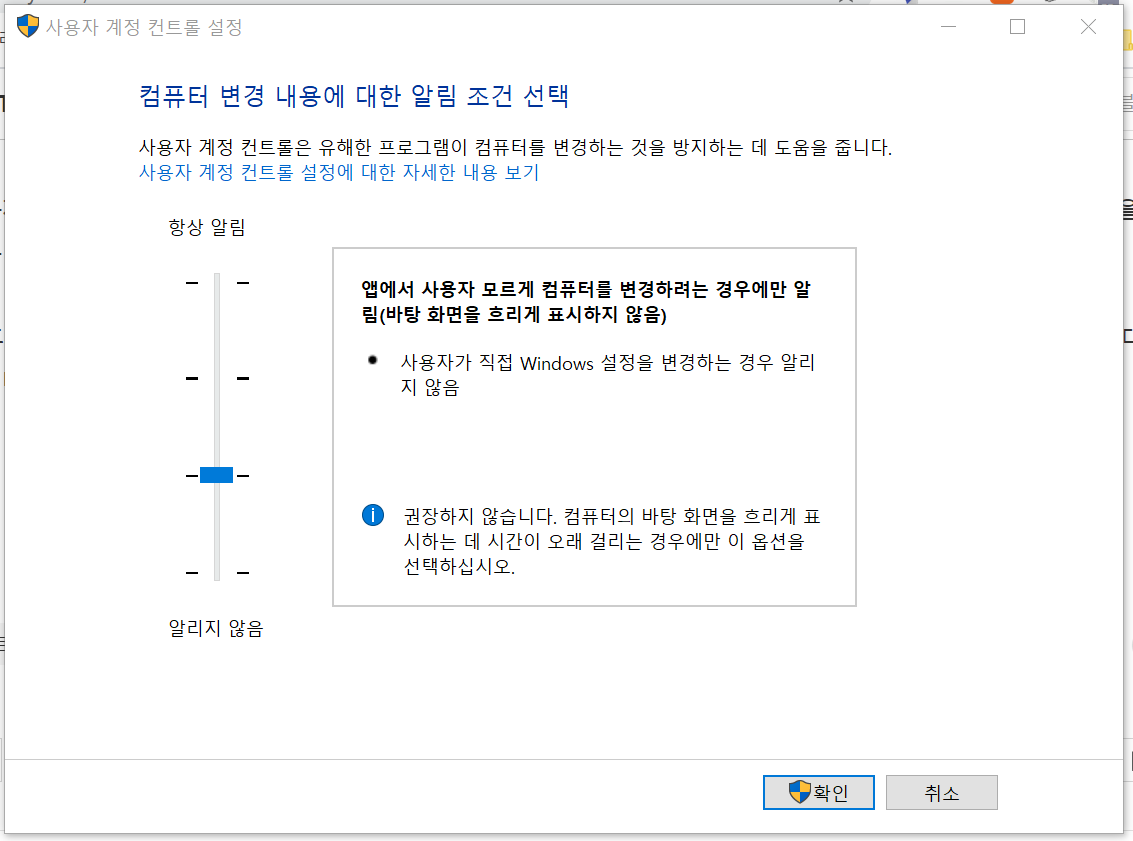 win10 부팅때마다 나오는 '사용자 계정 컨트롤' 프로그램 팝업 안뜨게 하는 방법