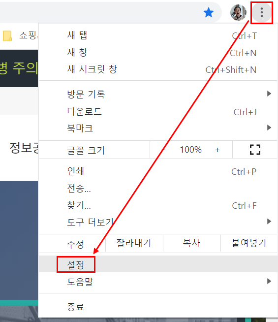 첫번째로 크롬을 실행하신후 우측상단의 점세개를 클릭하시면 쭉나오는 메뉴중 '설정' 으로 들어갑니다.