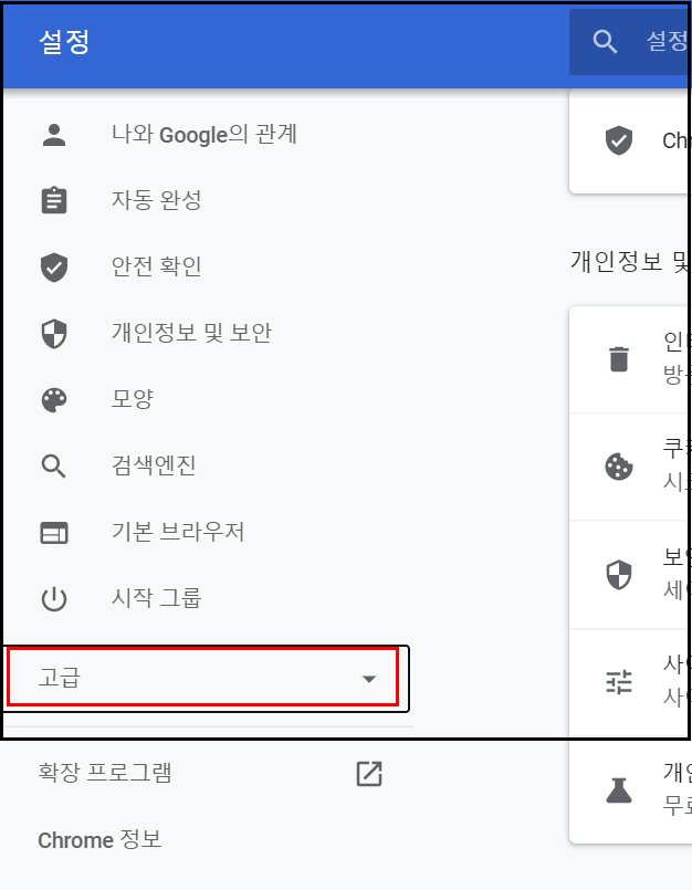 설정페이지에서 '고급'메뉴를 펼쳐봅니다.